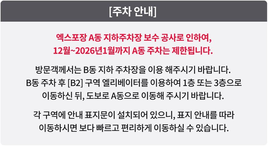 * 주차여부 : 여수엑스포 A, B동 지하주차장(3시간 무료이벤트 중, 매표에서 등록)