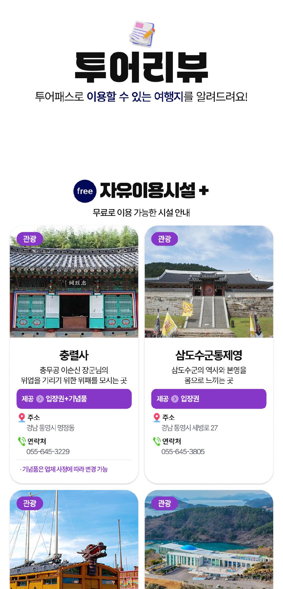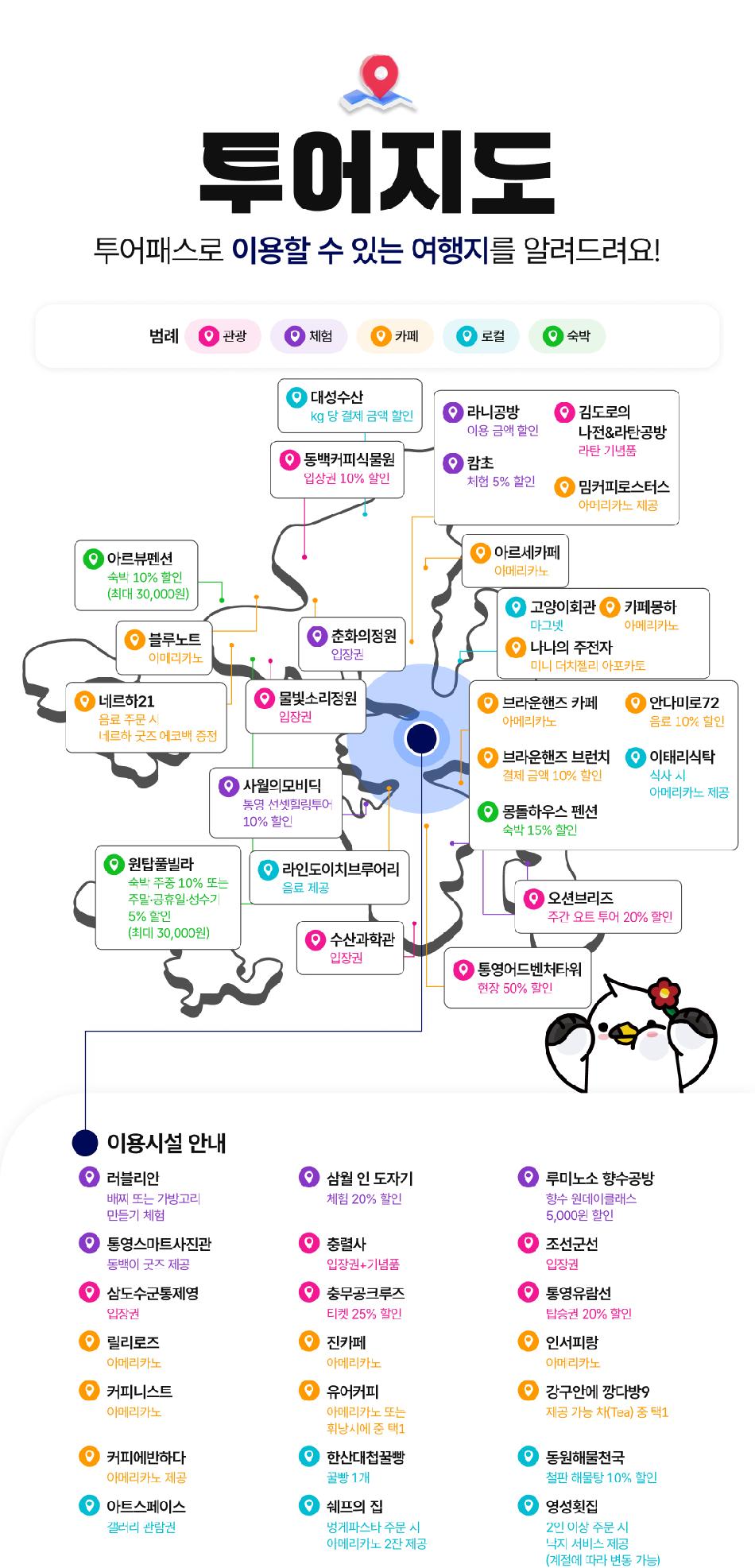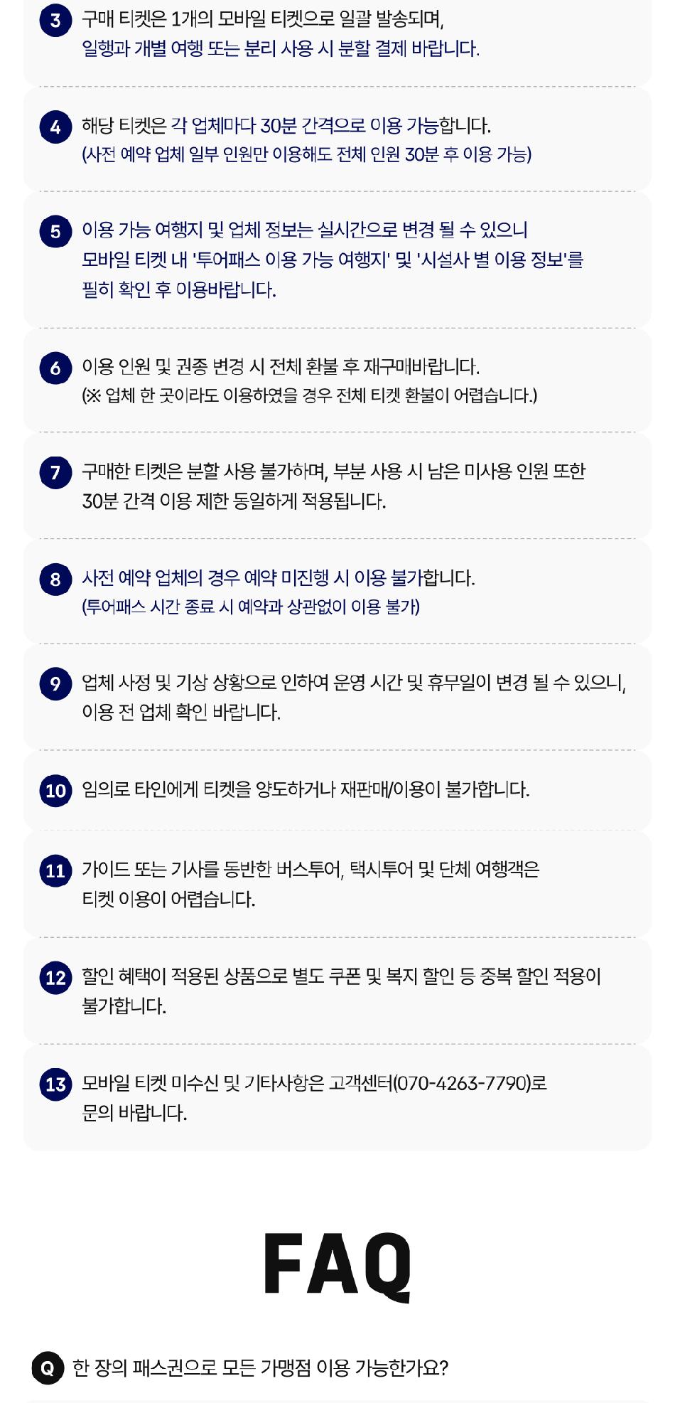 * 이용 가능한 업체 리스트는 구매 후에도 실시간으로 변경 될 수 있으니 모바일 티켓의 ‘투어패스 이용가능 여행지’를 확인 하시어 이용 바랍니다.