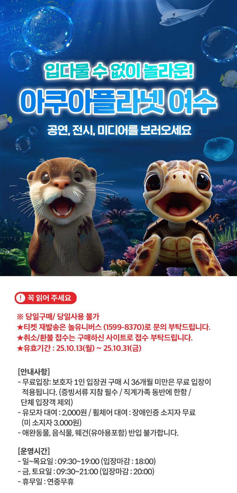 아쿠아플라넷 여수 10월 비수기(10/13~31) 입장권&종합권