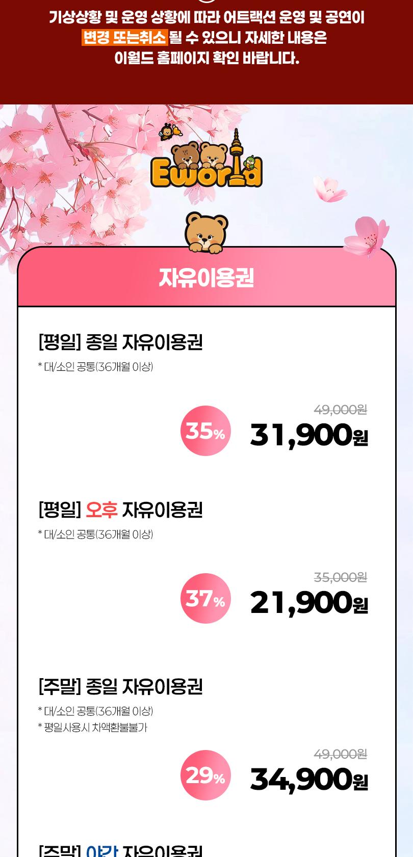 - 이월드 이용 고객 할인적용(일일요금) : 자유이용권 3,000원 / 연간회원권 2,000원