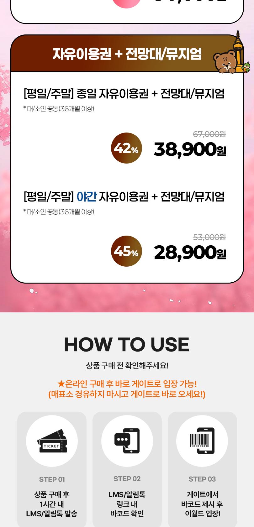 * 무료입장 : 36개월 미만 증빙서류 지참 시 무료입장 적용 (유료체험시설 또는 유아시설 이용 시 별도이용요금)