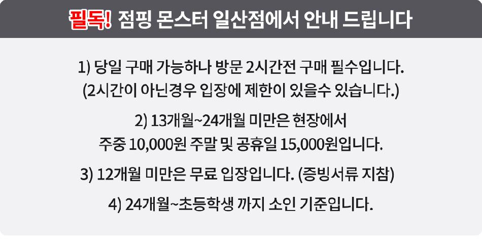 * 13개월~24개월 미만 유아는 주중 10,000원, 주말 및 공휴일 15,000원에 종일 이용 가능합니다. (현장결제)