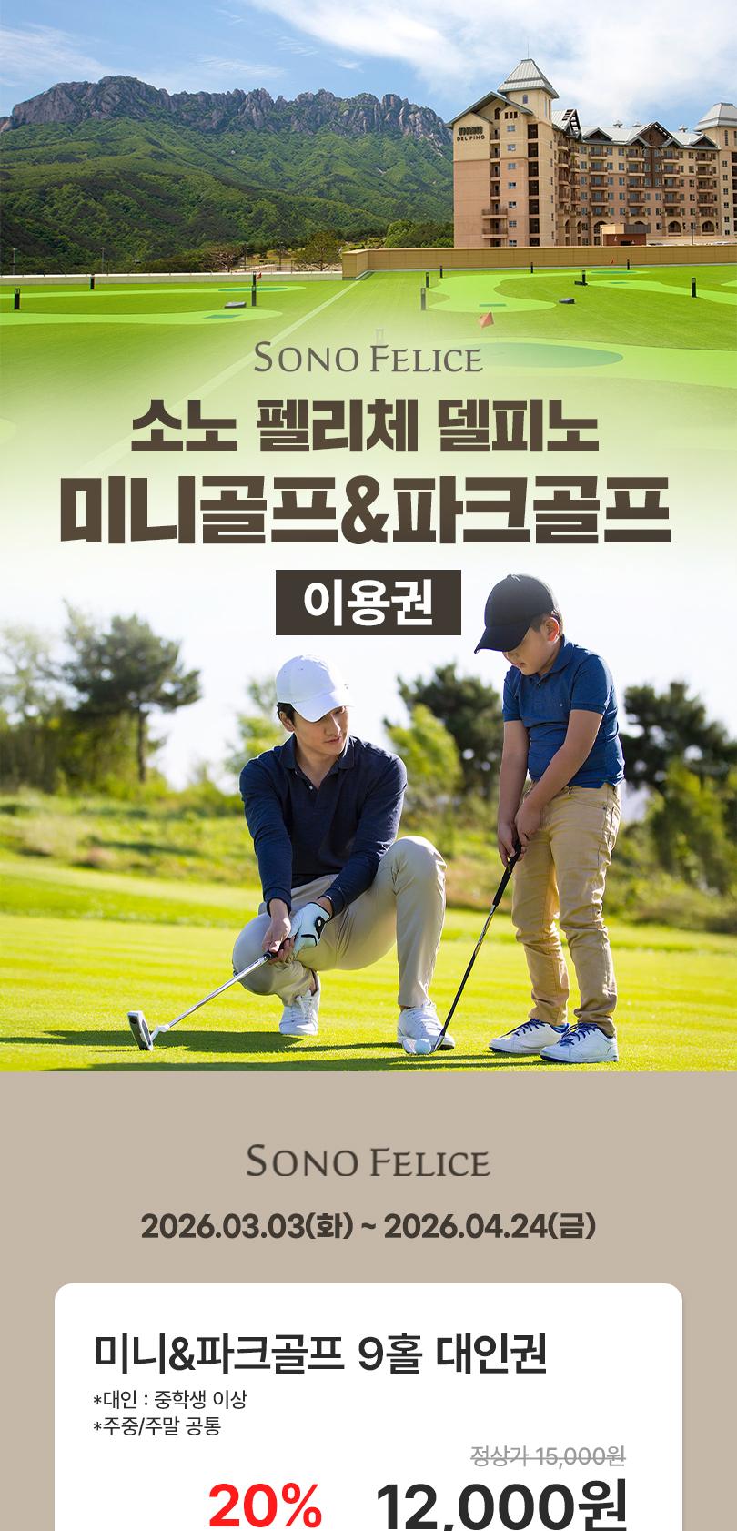 * 9홀 기준 이용권이며, 미니골프 또는 파크골프 중 택1 이용 가능합니다.
