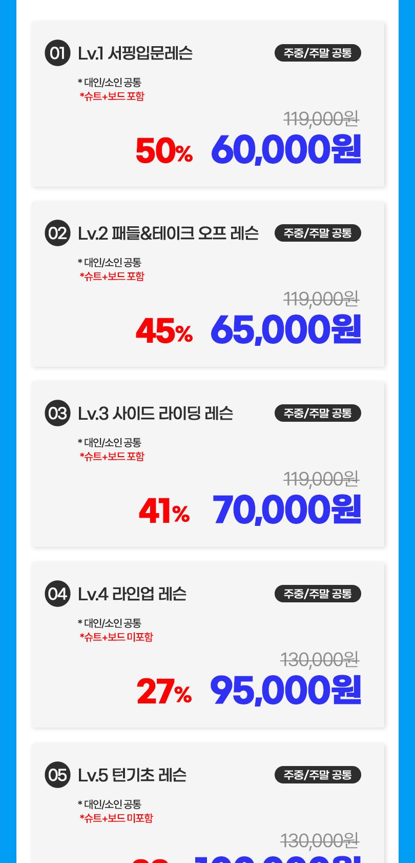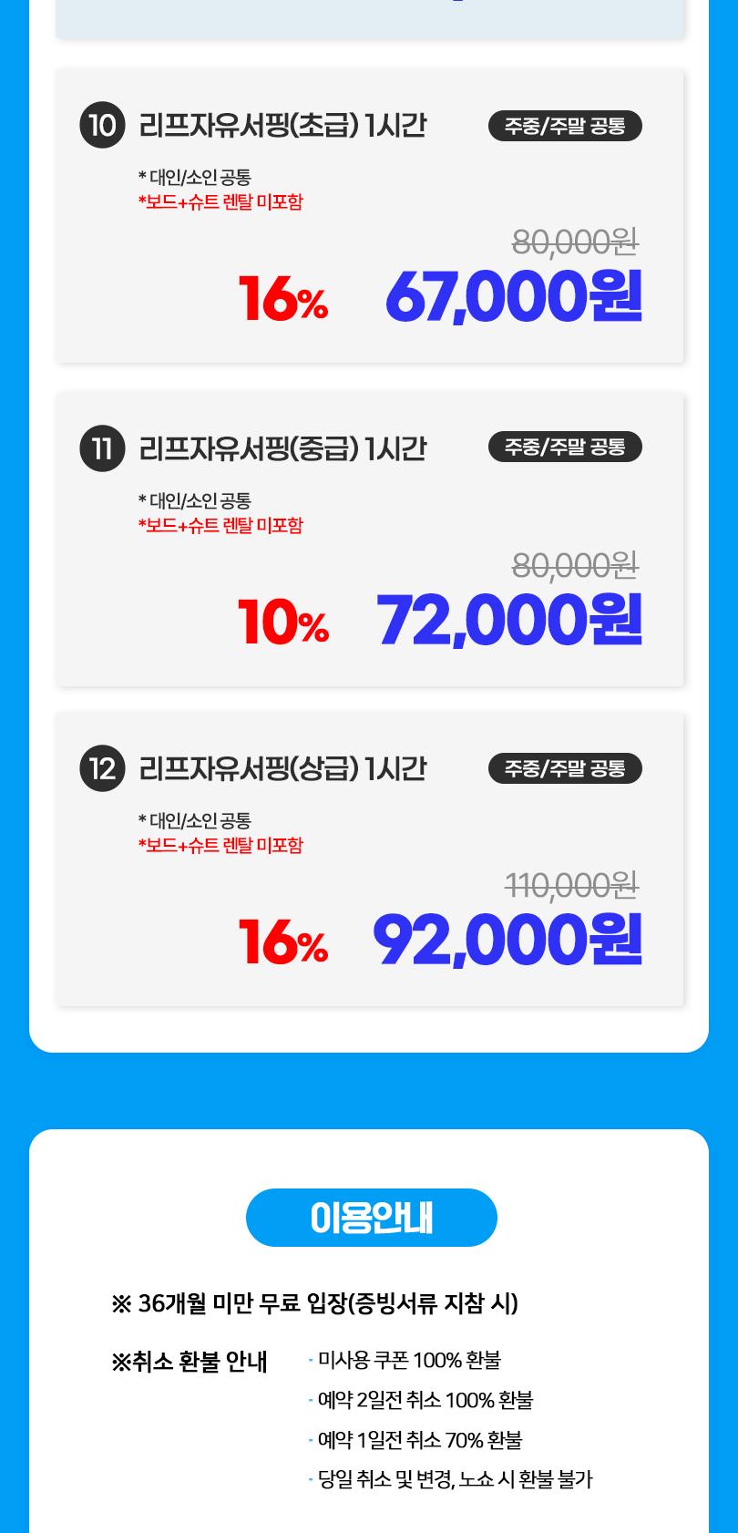 - 슈트 및 보드 등 대여 품목은 현장에서 결제 및 이용 가능